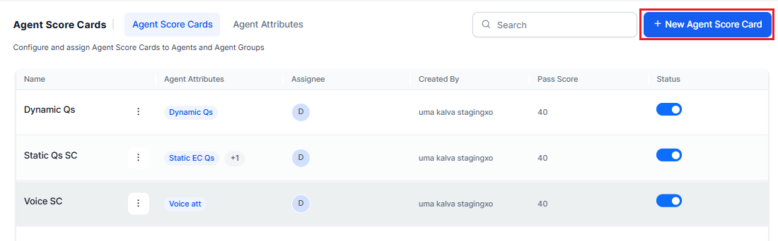 Select Create. The system adds the new scorecards created for the agent or agent group. Enable the status toggle to start agent-level scoring based on that scorecard.