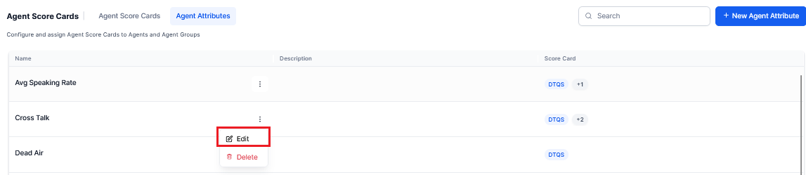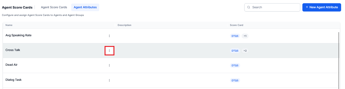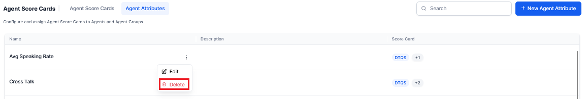 From the Agent Score Cards, select the Agent Attributes > +New Agent Attribute displayed on the top-right corner of the Agent Attributes page.