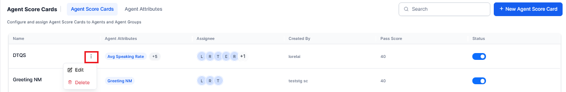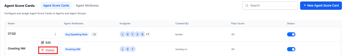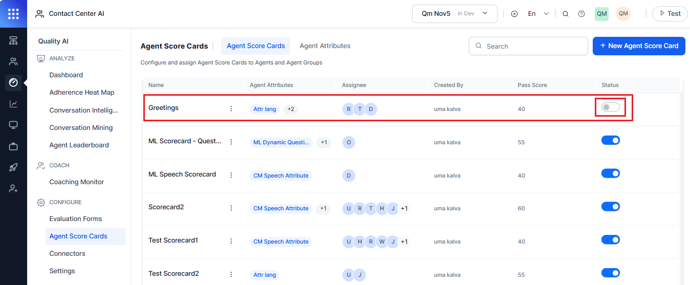 Click Create, the newly created scorecard for the agent and agent group is added as shown below and the status toggle must be enabled to start agent level scoring based on that scorecard.
