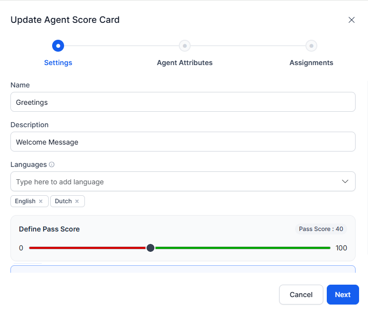 Enable the Mark as Default toggle option to assign the default scorecards across all agents. By default, the toggle option is enabled for the first scorecard created. The pass score must be configured (40 by default).