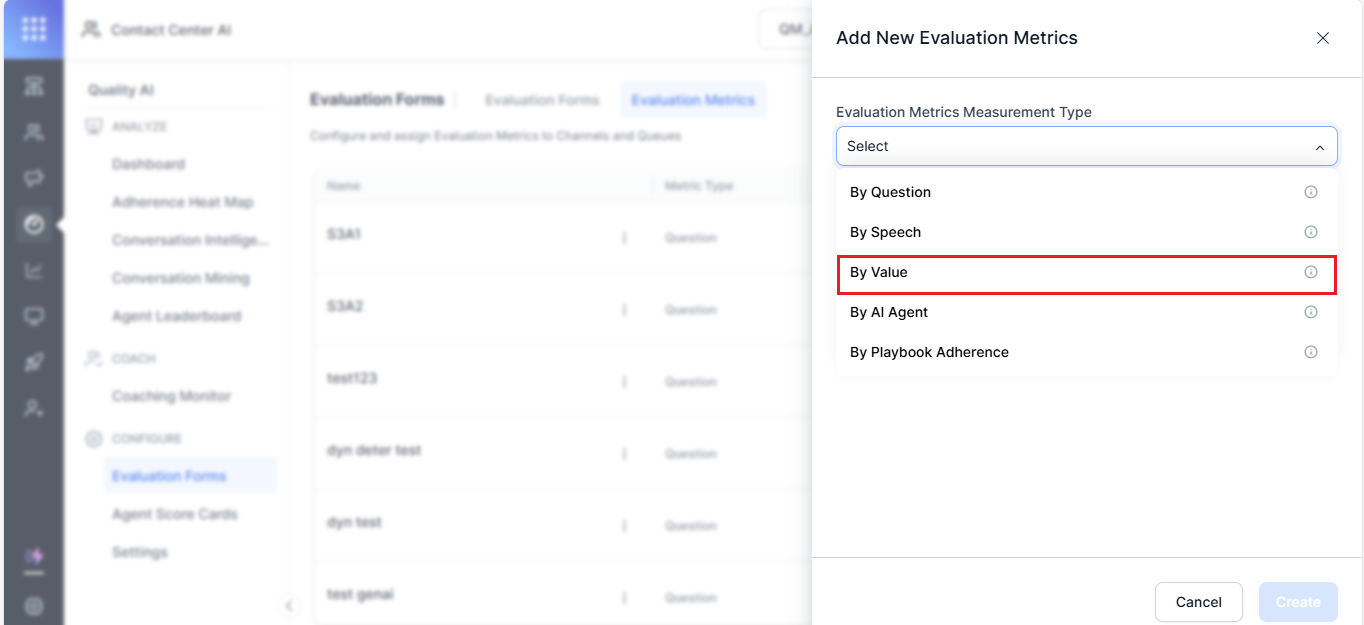The By Value metric type only appears in the evaluation metrics creation dropdown when the GenAI feature is enabled.