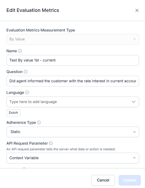 Determines how the extracted agent’s answer is evaluated against the backend or expected value. Supports static or trigger-based evaluation to choose the evaluation method based on your complexity requirements (for example, only when a customer asks about interest rates).