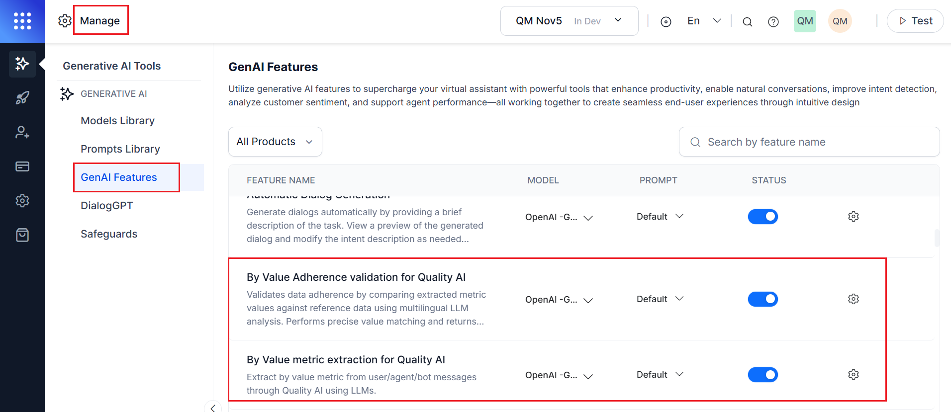 The By Value evaluation metrics measurement type is available when both the GenAI options are enabledand published via Manage> Generative AI> GenAI Features: