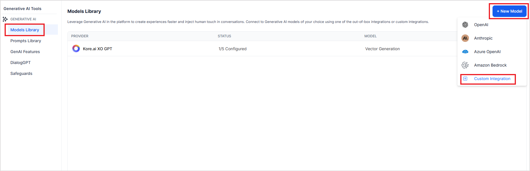 For custom models or commercial models that are not natively integrated in Search AI, you must set them up using the Custom Integration option in Model Library. This allows you to connect to externally hosted models via their API endpoints.
