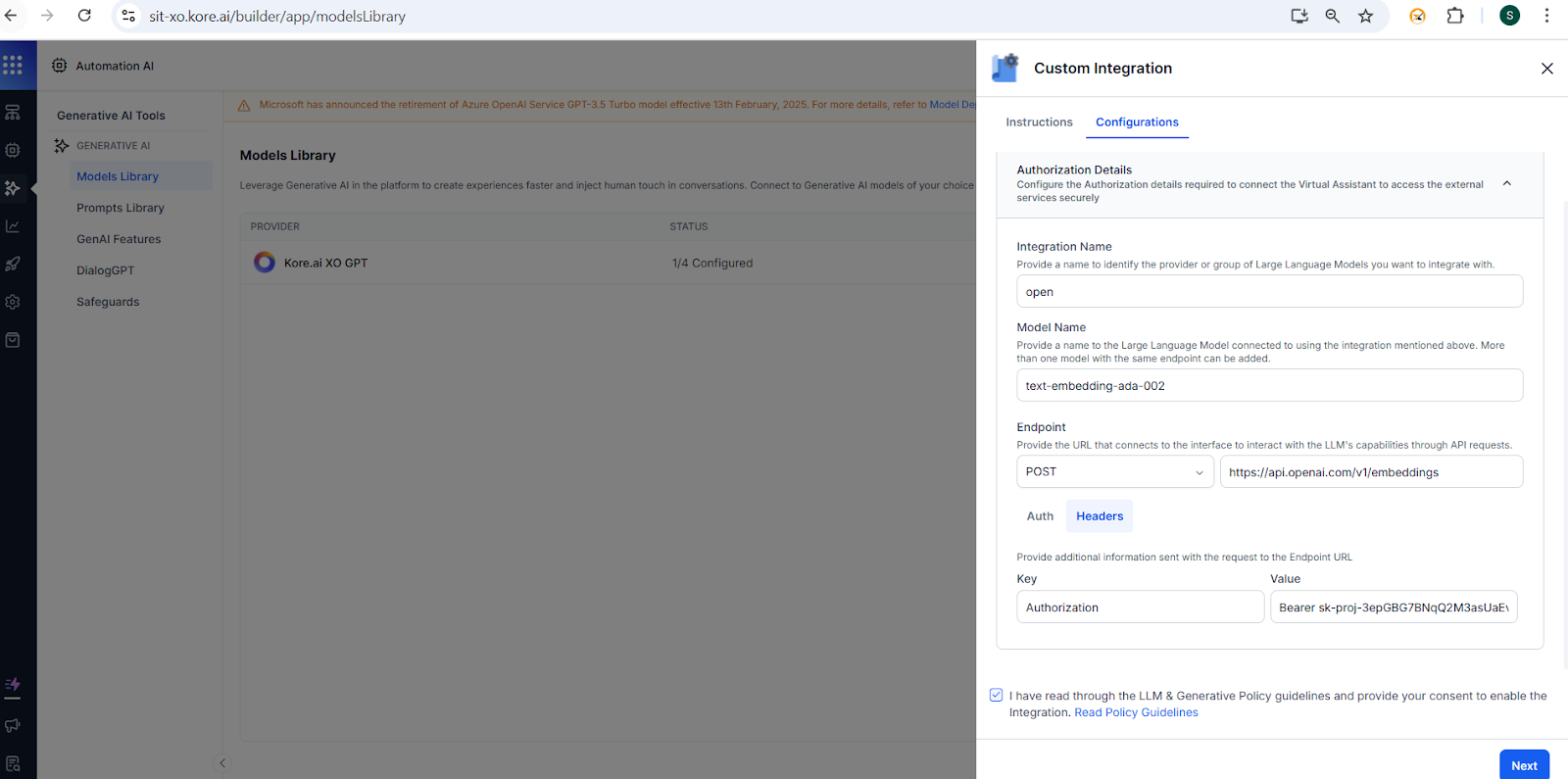 - Model - Select the custom model integrated above. You cannot select Kore XO GPT model here.