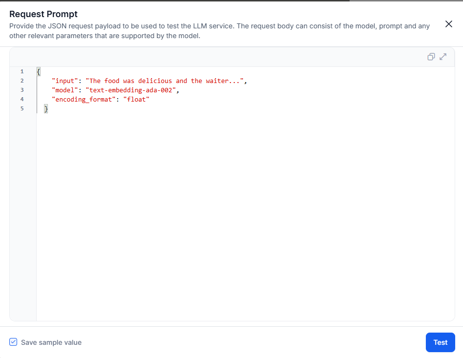 - Provide sample values for the dynamic variables like embedding_input and click on Test. This initiates a call to the model and generates the response corresponding to the request.